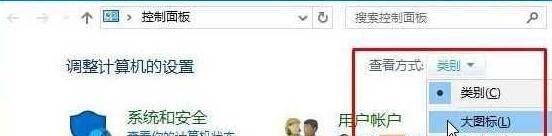 2、在控制面板右上角的“查看方式”修改为大图标;