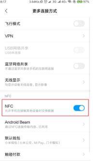 2、接着在此页面内的下方可看到NFC的字样,在此字样的后方有个开关,点击将其打开,即可开启该设备的NFC功能。
