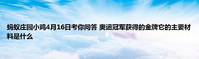 欢迎大家来到这里,能进来的小伙伴都有玩蚂蚁庄园的,支付宝蚂蚁庄园每天都会在小课堂更新一道题目,答对即可领取小鸡饲料180G,4月16日蚂蚁庄园问题是:奥运冠军获得的金牌它的主要材料是什么?很多小伙伴都不知道奥运冠军获得的金牌它的主要材料是什么这个问题的答案是什么,那么小编就为大家分享下4月16日蚂蚁庄园课题问题的答案,希望对大家有所帮助!