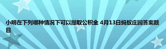 欢迎大家来到这里,能进来的小伙伴都有玩蚂蚁庄园的,支付宝蚂蚁庄园每天都会在小课堂更新一道题目,答对即可领取小鸡饲料180G,4月13日蚂蚁庄园问题是:小明在下列哪种情况下可以提取公积金?很多小伙伴都不知道小明在下列哪种情况下可以提取公积金这个问题的答案是什么,那么小编就为大家分享下4月13日蚂蚁庄园课题问题的答案,希望对大家有所帮助!