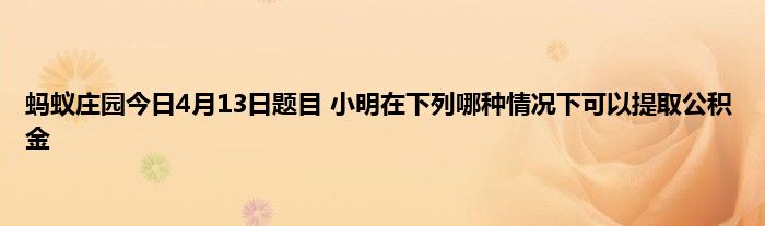 欢迎大家来到这里,能进来的小伙伴都有玩蚂蚁庄园的,支付宝蚂蚁庄园每天都会在小课堂更新一道题目,答对即可领取小鸡饲料180G,4月13日蚂蚁庄园问题是:小明在下列哪种情况下可以提取公积金?很多小伙伴都不知道小明在下列哪种情况下可以提取公积金这个问题的答案是什么,那么小编就为大家分享下4月13日蚂蚁庄园课题问题的答案,希望对大家有所帮助!